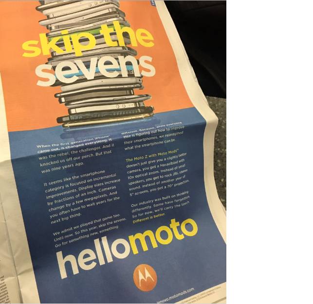 Além do comercial, a Motorola publicou no New York Times um anúncio de uma página inteira que mostra uma imagem de diversos iPhones e Galaxys empilhados, acompanhada da frase “Skip the sevens” – em português, “pule os setes” – fazendo uma referência aos smartphones das concorrentes, que estão em suas sétimas versões – O Galaxy S7 e o iPhone 7.
