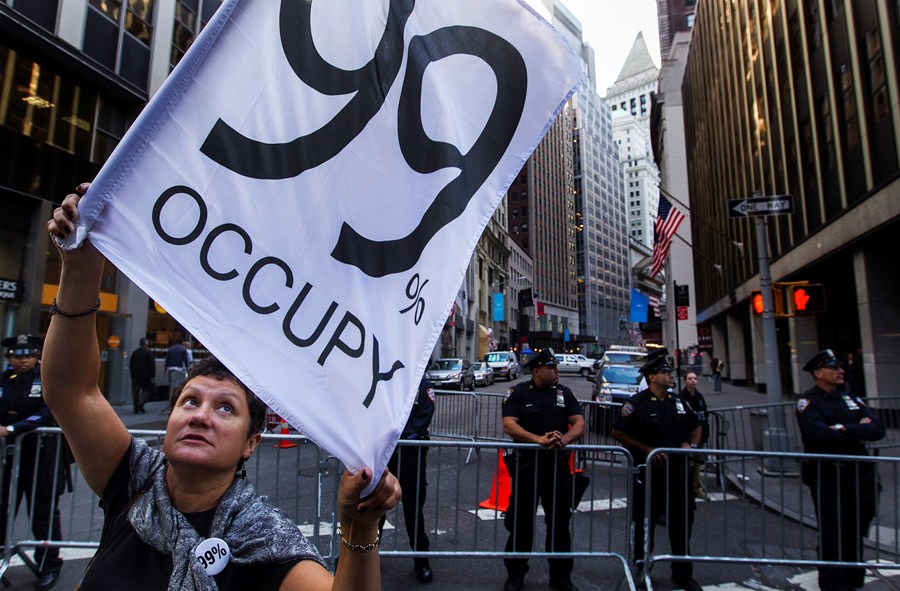 O grupo surpreendeu o mundo em setembro de 2011, ao montar um acampamento no parque Zuccoti, que serviu de quartel-general e iniciar protestos contra o sistema bancário. Ali nascia o movimento, cujo slogan é “Somos os 99%”, em referência à alegação de que eles representam 99% dos norte-americanos, descontente com o sistema financeiro, contra o 1% que concentra boa parte da riqueza do país.