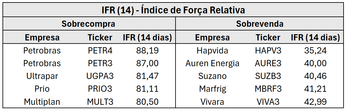 Também aparecem na lista das ações em região de sobrecompra: Petrobras (PETR3), Ultrapar (UGPA3), Prio (PRIO3) e Multiplan (MULT3).
