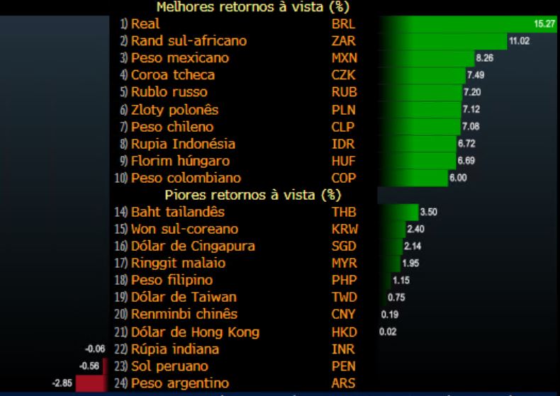 No mesmo período, o real também ficou na liderança, com valorização de 15,27% frente o dólar.