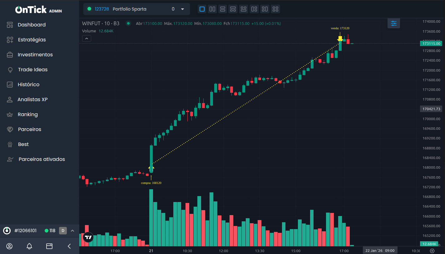O Portfólio Sparta, estratégia automatizada de operações disponível na OnTick Invest, investida da XP, alcançou nesta quarta-feira (21) um feito inédito: bateu seu target máximo de 5 mil pontos, nos contratos de mini-índice, zerando a operação pelo alvo e não pelo horário — algo que nunca havia acontecido desde o início do acompanhamento, há mais de um ano e meio.