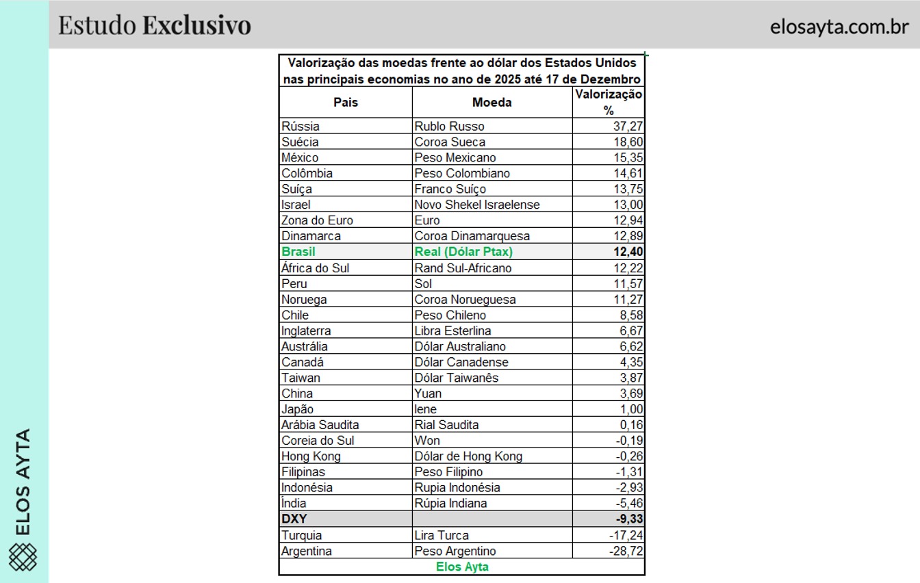 No caso do real brasileiro, houve valorização de cerca de 12,4% em relação ao dólar, refletindo tanto esse enfraquecimento global da moeda americana quanto fatores domésticos.