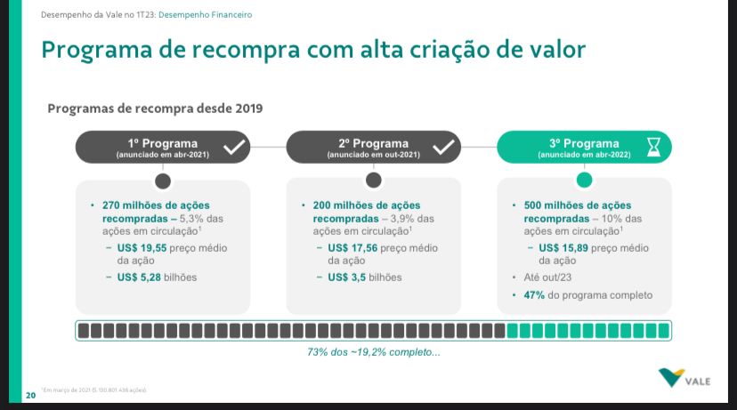 A mineradora, em sua teleconferência do quarto trimestre de 2022, realizada em março, afirmou que já havia adquirido 683 milhões de ações nos seus três programas.