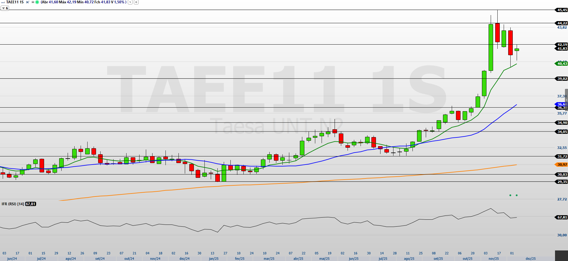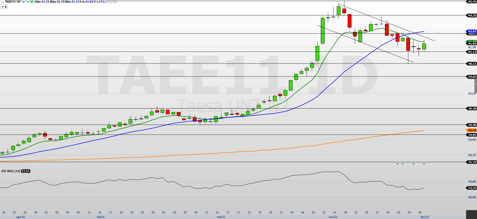 Os principais suportes estão em R$ 41,12, R$ 40,11, R$ 39,00, R$ 36,30, R$ 34,90 e R$ 34,00. Pelo lado superior, TAEE11 precisa superar R$ 42,87 e R$ 44,22 para voltar a mirar a máxima histórica em R$ 45,45. Caso esse patamar seja rompido, os próximos alvos projetados ficam em R$ 46,25 e R$ 47,40. Enquanto isso não ocorre, sigo atento ao risco de aprofundamento da correção, especialmente se a região de suporte mais próxima for perdida.
