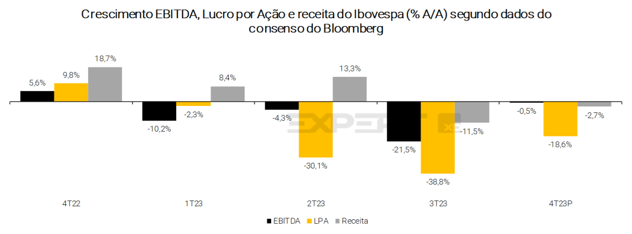 A temporada de resultados do quarto trimestre de 2023 (4T23) tem início nesta semana com os resultados do Santander Brasil (SANB11) e trazendo a perspectiva geral de mais um trimestre morno, embora com uma contração de lucros menor do que o trimestre anterior. Em relatório de estratégia assinado por Fernando Ferreira e Jennie Li, a XP destaca que, em comparação com o 4° trimestre de 2022, o consenso do mercado, segundo dados do Bloomberg, espera uma queda anual do lucro por ação (LPA), Ebitda (lucros operacionais, ou lucro antes de impostos, depreciações e amortizações) e receita em 19%, 1% e 3%, respectivamente. Confira abaixo no geral para os balanços: