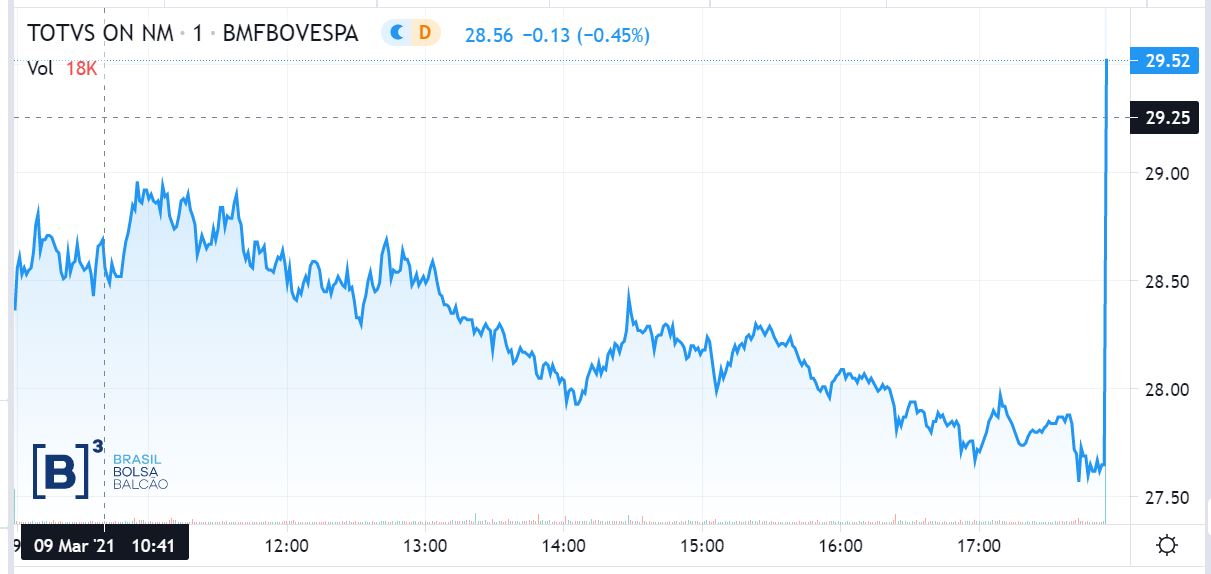 A nota oficial foi divulgada às 18h05 (horário de Brasília) durante o leilão de fechamento do mercado e impactou as ações da companhia: os ativos TOTS3, que até então estavam em queda de 2,54%, a R$ 27,65 (segundo cotação das 17h54), fecharam na máxima do dia, com alta de 4,05% a R$ 29,05, como pode ser observado no gráfico a seguir: