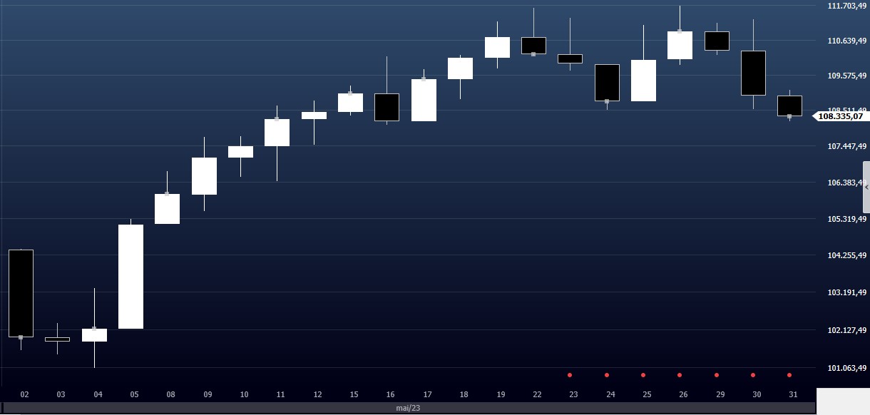 O Ibovespa encerrou maio com alta de 3,74%, entretanto nos últimos pregões do mês passado o índice perdeu tração, tendo seus ganhos desidratados. Maio chegou a contar com oito pregões consecutivos de ganhos, levando o índice a atingir a região de 111,7 mil pontos (em 26 de maio) – região considerada como primeiro alvo de resistência, por analistas técnicos.