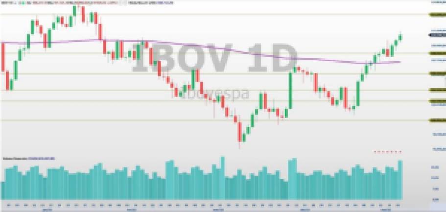 Segundo relatório de análise técnica da XP, assinado por Gilberto Coelho, o Ibovespa segue em sua tendência de alta, trabalhando acima das médias de 21 e 200 dias. Conforme Coelho, o Índice de Força Relativa (IFR) está sobrecomprado, sugerindo “cautela com possíveis realizações”.