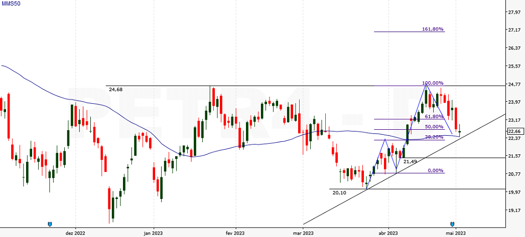 Pensando no curto prazo, o analista da Terra Investimentos, Régis Chinchila, destaca que as ações da Petrobras (PETR4) fizeram um pivô de alta em abril e, no momento, fazem uma correção técnica de baixa. “Importante acompanhar a faixa de suporte dado pela MM50 e a proporção de Fibonacci”, disse.