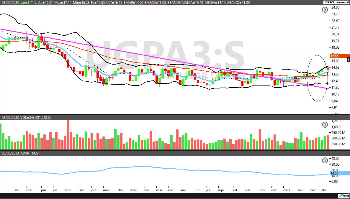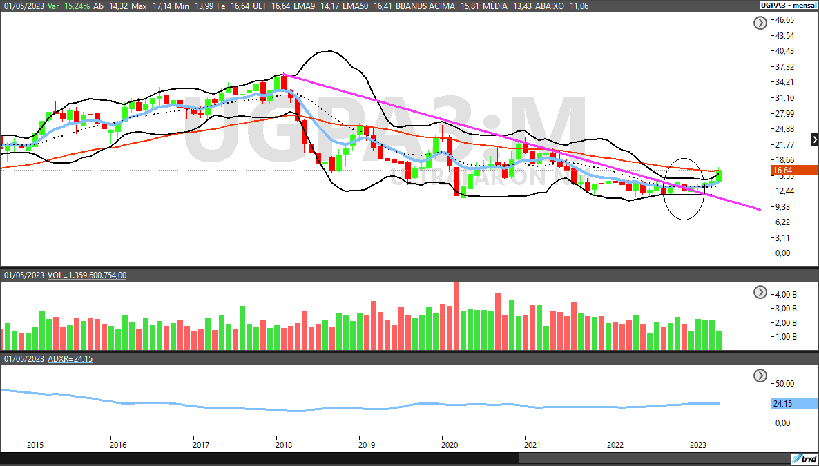 Por fim, para Milen, da Harami, a ação de UGPA3 está com tendência de alta, devido ao rompimento de uma LTB (linha de tendência de baixa), confirmada pelo aumento do ADX.