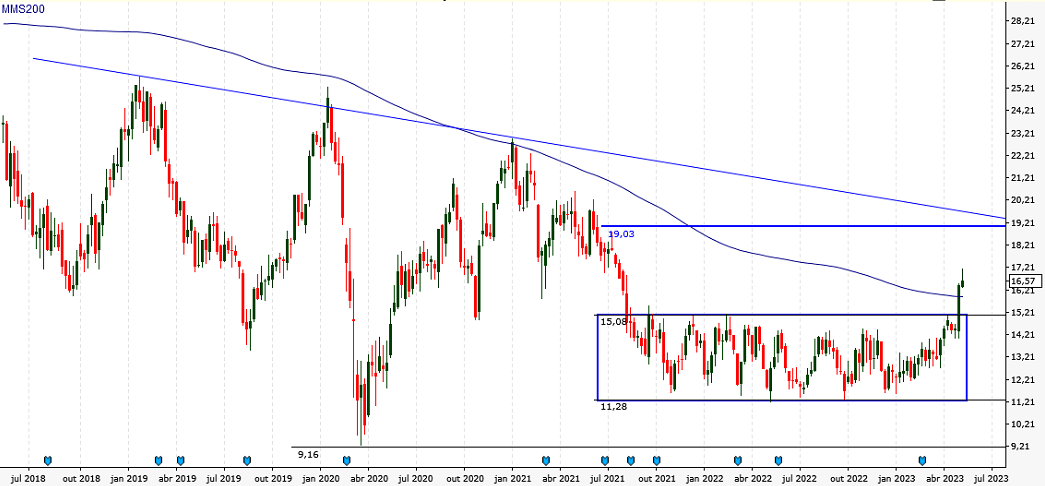Isso segue, entende ela, enquanto o ativo não romper o fundo de 2020, dos R$ 9,80, “que confirmaria uma tendência de baixa, já que traçou um topo mais baixo que o anterior, em R$ 23,60.”