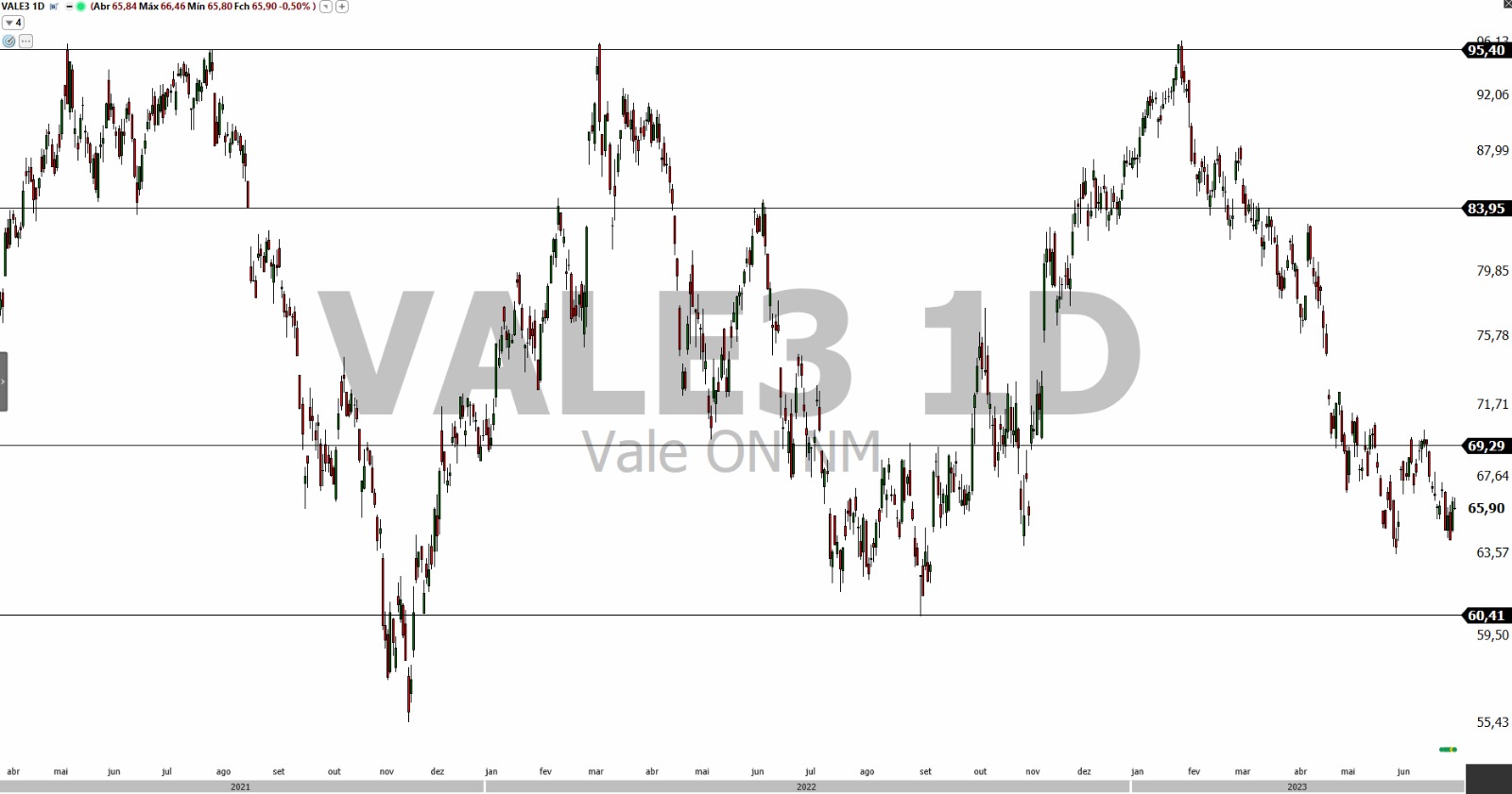 As ações da Vale estão consolidadas desde 2021, como se vê no gráfico abaixo; ou seja, estão desde esse período, até os dias de hoje, oscilando entre a cotação de R$ 95,95 – seu ponto de resistência – e têm importantes pontos de suporte em R$ 60,40 e R$ 55,40.