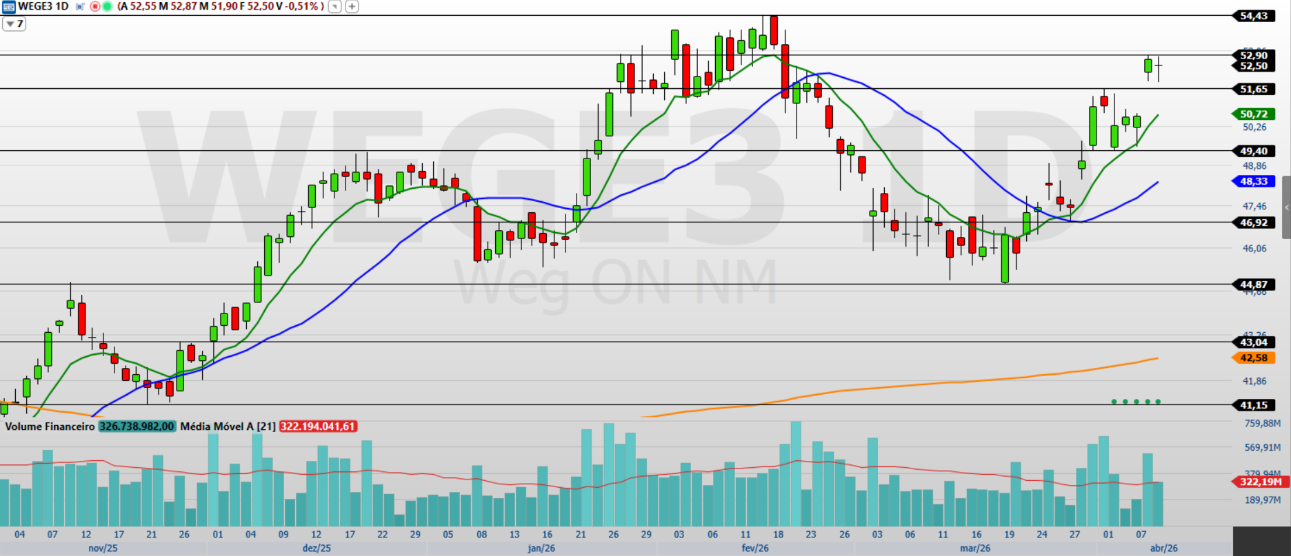 Na minha leitura, a WEG S.A. (WEGE3) segue com uma estrutura técnica sólida, mantendo o viés positivo mesmo após a leve realização recente. O ativo recuou 0,51% na última sessão, encerrando aos R$ 52,50, movimento que interpreto como ajuste pontual dentro de uma tendência de alta ainda preservada. No acumulado de 2026, o papel já sobe 8,43%, o que reforça o fluxo comprador e o interesse pelo ativo.