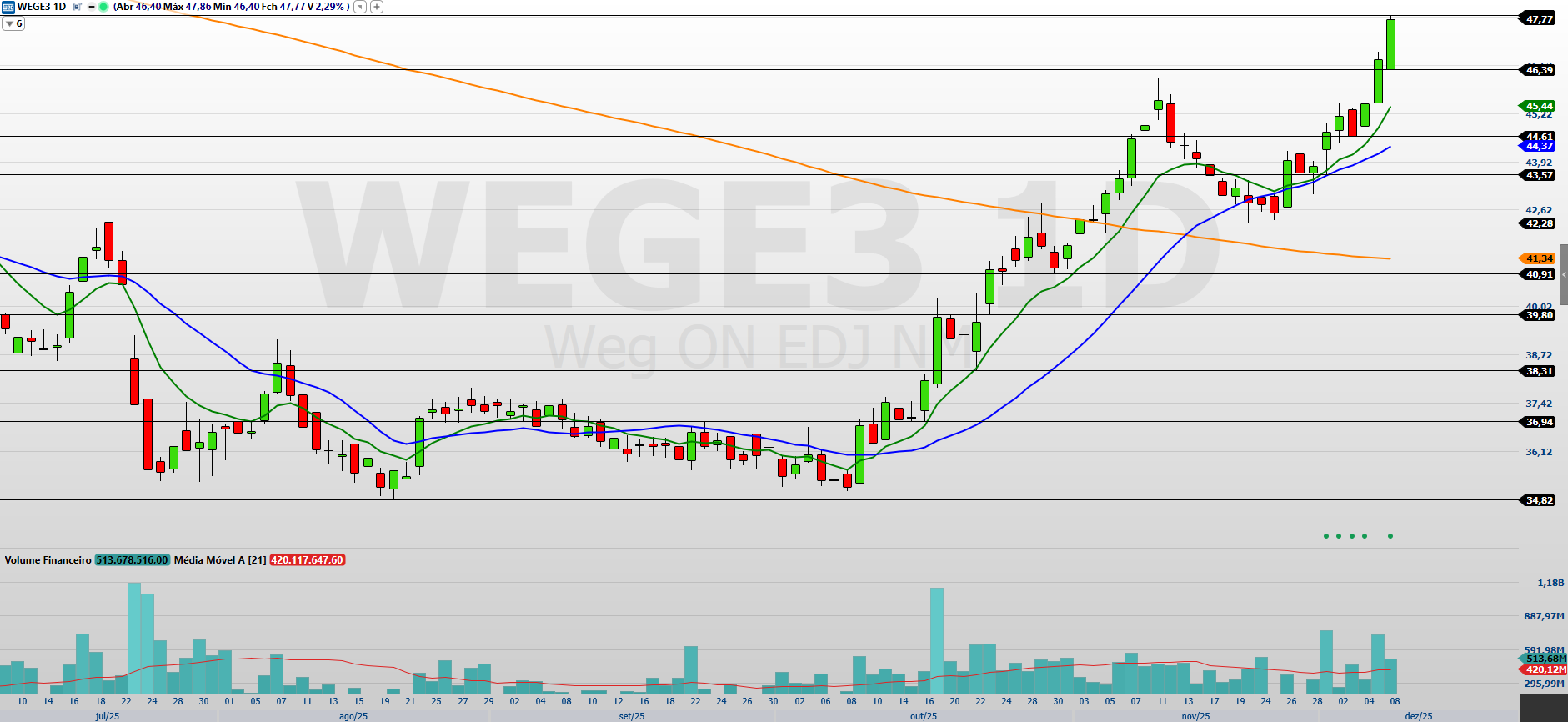 No semanal, a Weg evidencia um processo de recuperação mais amplo. Mesmo acumulando queda de 7,03% em 2025, o ativo voltou a reagir após respeitar o suporte de R$ 34,82, ponto central da reversão. Com a cotação atual em R$ 47,77, o papel avança 9,01% em dezembro e se aproxima da marca de três meses consecutivos de alta — um sinal importante de mudança estrutural.