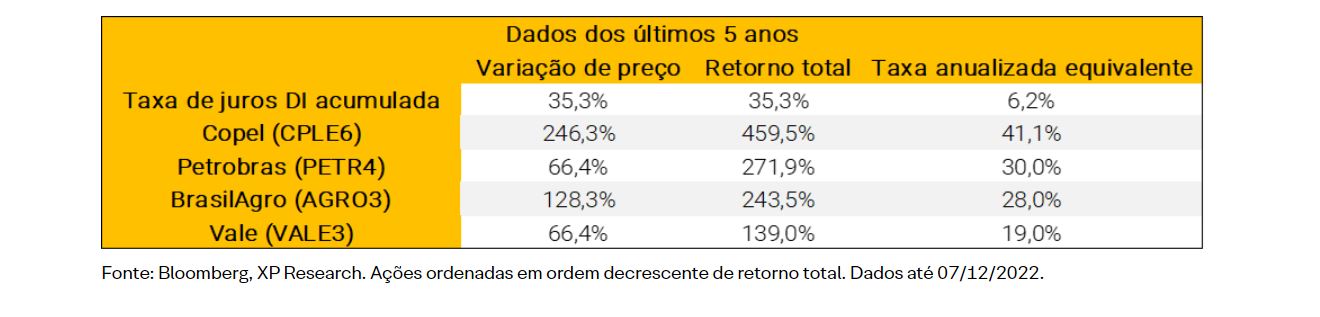 Sobre o último ponto, os estrategistas destacam ações da Bolsa que são boas pagadoras de dividendos, comparando a variação de preço com o seu retorno total, mostrando um quadro (que segue abaixo) das que acumularam um retorno total anualizado de 20% a 40% nos últimos cinco anos, significativamente maior do que o taxa DI acumulada durante o mesmo período em 6,2%.