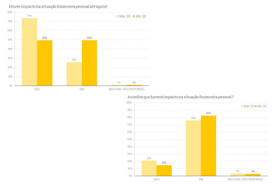 Ainda, dos entrevistados, 94% acreditam que a pandemia do coronavírus terá um impacto negativo para a economia brasileira. Além da vida financeira, essa percepção também se reflete no dia a dia das pessoas nesse período.