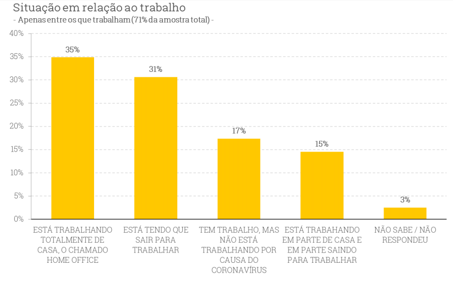 Do universo de entrevistados da pesquisa, a maioria (35%) está fazendo home office em tempo integral. Outra parcela (31%) está trabalhando normalmente, 17% está empregado, mas não está trabalhando e 15% está fazendo home office, mas indo para o trabalho eventualmente.
