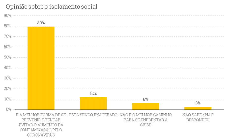 Em um momento em que o país enfrenta a pandemia do coronavírus, o isolamento social passa a ser uma ferramenta importante no combate à disseminação do vírus, segundo a maioria dos entrevistados. Para 80% das pessoas, ficar em casa é a melhor solução neste momento. Uma parcela de 12% acha a medida exagerada e 6% dos entrevistados não acreditam que é a melhor forma de enfrentar a crise.