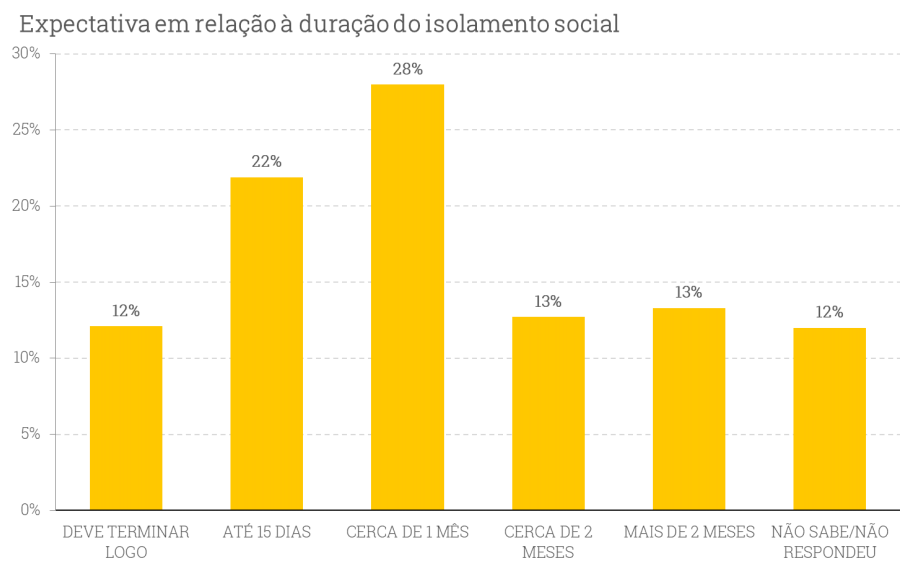 Já em relação à duração do período de isolamento, a maior parcela (28%) acredita que ainda vai se estender por mais um mês. Por outro lado, 12% acreditam que deve acabar “logo”.