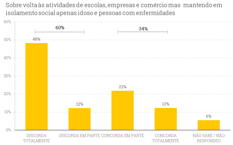 Segundo o levantamento, 89% dos entrevistados tomaram conhecimento das declarações do presidente sugerindo o fim do isolamento. E 60% discordam em parte ou totalmente do isolamento vertical, em que apenas idosos e pessoas com enfermidades devem ficar de quarentena, enquanto escolas, empresas e comércio devem voltar a funcionar.