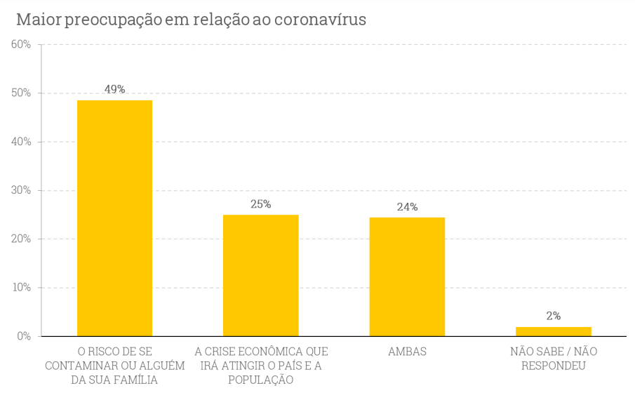 Embora a situação econômica esteja alarmante, a maior preocupação dos entrevistados atualmente é ser contaminado (a) ou que alguém da família seja (49%), seguida pelo receio da crise econômica (25%). Os outros 24% dos entrevistados afirmaram que ambas as preocupações estão no topo da lista.