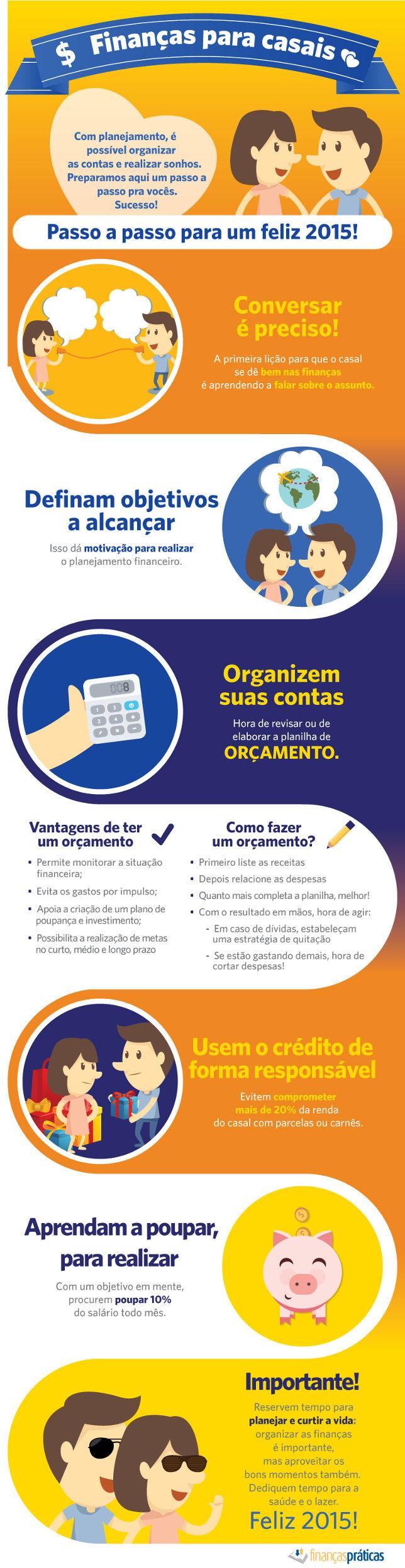 Para ajudar os casais em como lidar com as finanças a quatro mãos, o site Finanças Práticas preparou um infográfico com algumas dicas.