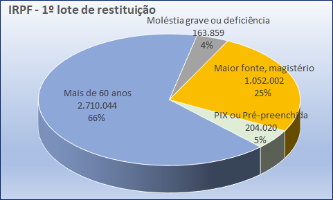 Historicamente, no primeiro lote são contemplados os contribuintes que pertencem aos grupos de prioridade legal: idosos, pessoas com doenças graves, portadores de deficiência e professores. E uma das novidades de 2023 foi que o Fisco criou um novo grupo, justamente para quem enviasse a declaração no modelo automatizado ou optasse pelo Pix no recebimento dos valores a restituir.