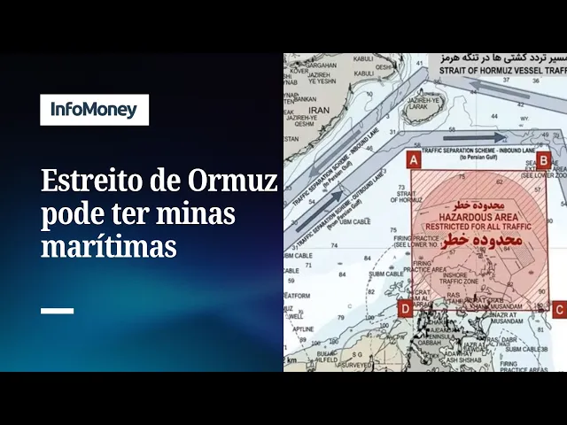 Agências de notícias semioficiais do Irã publicaram nesta quinta-feira (9) um gráfico que sugere que a Guarda Revolucionária Islâmica colocou minas marítimas no Estreito de Ormuz durante a guerra. A imagem mostra um grande círculo marcado como “zona de perigo” sobre o Esquema de Separação de Trânsito, que é a rota que os navios utilizam para cruzar a passagem.