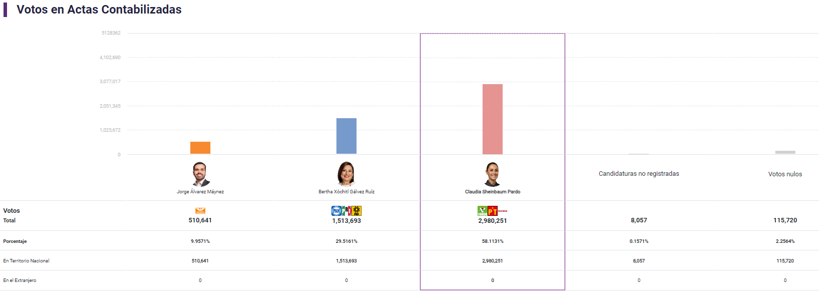 De acordo com dados do Instituto Nacional Electoral (INE) do México, às 01h27 desta segunda-feira (3), pouco mais de 9% das urnas foram abertas e os primeiros resultados confirmavam favoritismo de Sheinbaum, que somava 58% dos votos.