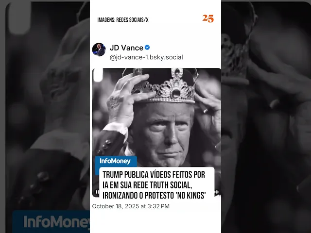 Foi com extrema ironia que o presidente dos Estados Unidos, Donald Trump, reagiu à manifestação “No Kings” (“Sem Reis”), que tomou conta de centenas de cidades americanas neste sábado. Em sua rede Truth Social, o republicano repostou vídeos criado por inteligência artificial e enviados por apoiadores nos quais ele aparece simbolicamente usando um coroa.