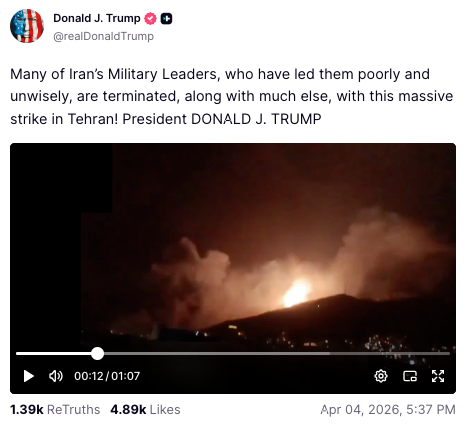 O presidente dos Estados Unidos, Donald Trump, afirmou neste sábado (4) que líderes militares do Irã foram “eliminados” em um ataque ‘maciço’ em Teerã. A declaração foi publicada às 17h37 (horário de Brasília) na rede social Truth Social e foi acompanhada de um vídeo com imagens de ataques.