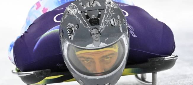 O atleta ucraniano de skeleton Vladyslav Heraskevych usa capacete que homenageia mais de 20 atletas e treinadores mortos na guerra de seu país contra a Rússia. Foto: Reprodução