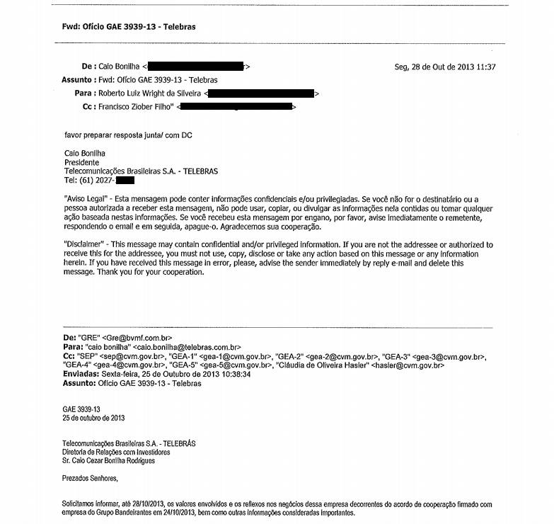 Após ser indagada pela CVM a respeito de um comunicado, enviado ao mercado na última sexta-feira, o presidente da companhia Caio Bonilha pediu para seus comandados elaborarem uma resposta para a autarquia. Eles elaboraram. Mas acabaram enviando o pedido junto: expondo telefone e e-mail dos envolvidos na troca de mensagens.
