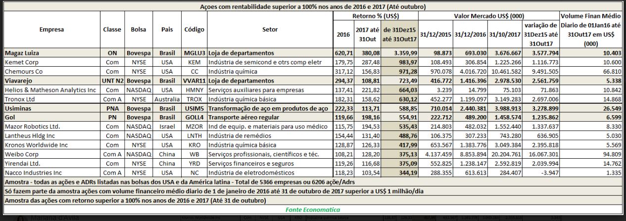 No levantamento feito pela Economatica, foram consideradas na amostra somente ações que atendiam aos critérios: retorno superior a 100% no ano de 2016 e no ano de 2017 até o dia 31 de outubro em dólares e volume financeiro médio diário de 1 de janeiro de 2016 até 31 de outubro de 2017 superior a US$ 1 milhão.