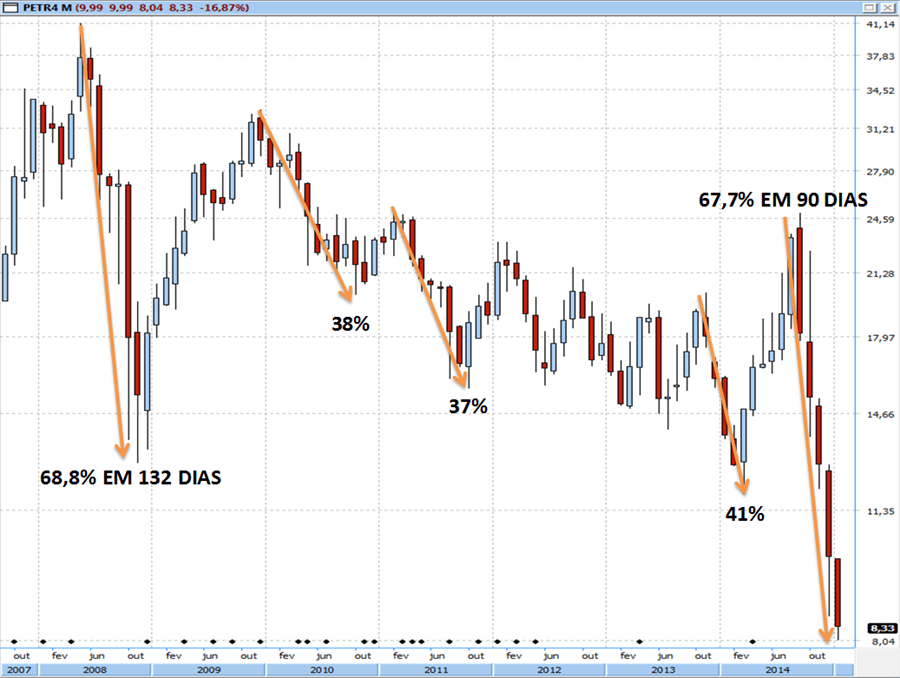 Ainda assim, vale observar (conforme mostra o gráfico abaixo) que o movimento dos papéis da companhia costumam se repetir, como nas quedas entre 38% (em 2010) e 41% (entre o final de 2013 e início de 2014). Então, como interpretar essa informação?