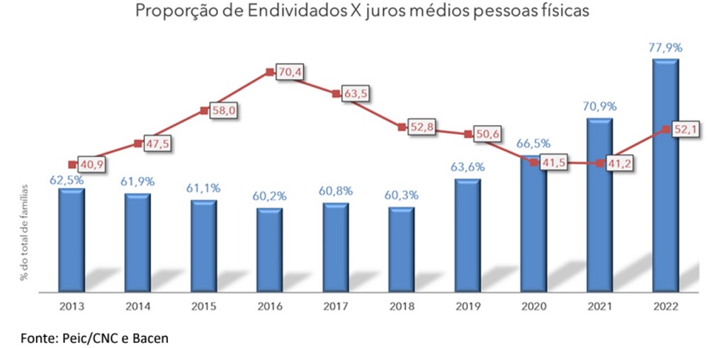 Em 2022, a cada 100 famílias, 78 se endividaram, segundo pesquisa da CNC. É o recorde de uma série anual iniciada em 2010. O crescimento do endividamento entre 2021 e 2022 foi de 7 pontos percentuais (de 70,9% para 77,9%) , sendo o quarto consecutivo e o maior já observado na pesquisa.