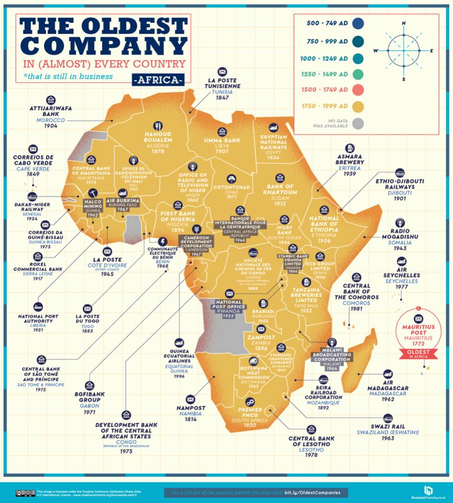 Boa parte das empresas mais antigas da África está nos setores de serviços postais e bancos – a grande maioria fundada pelos antigos colonizadores.