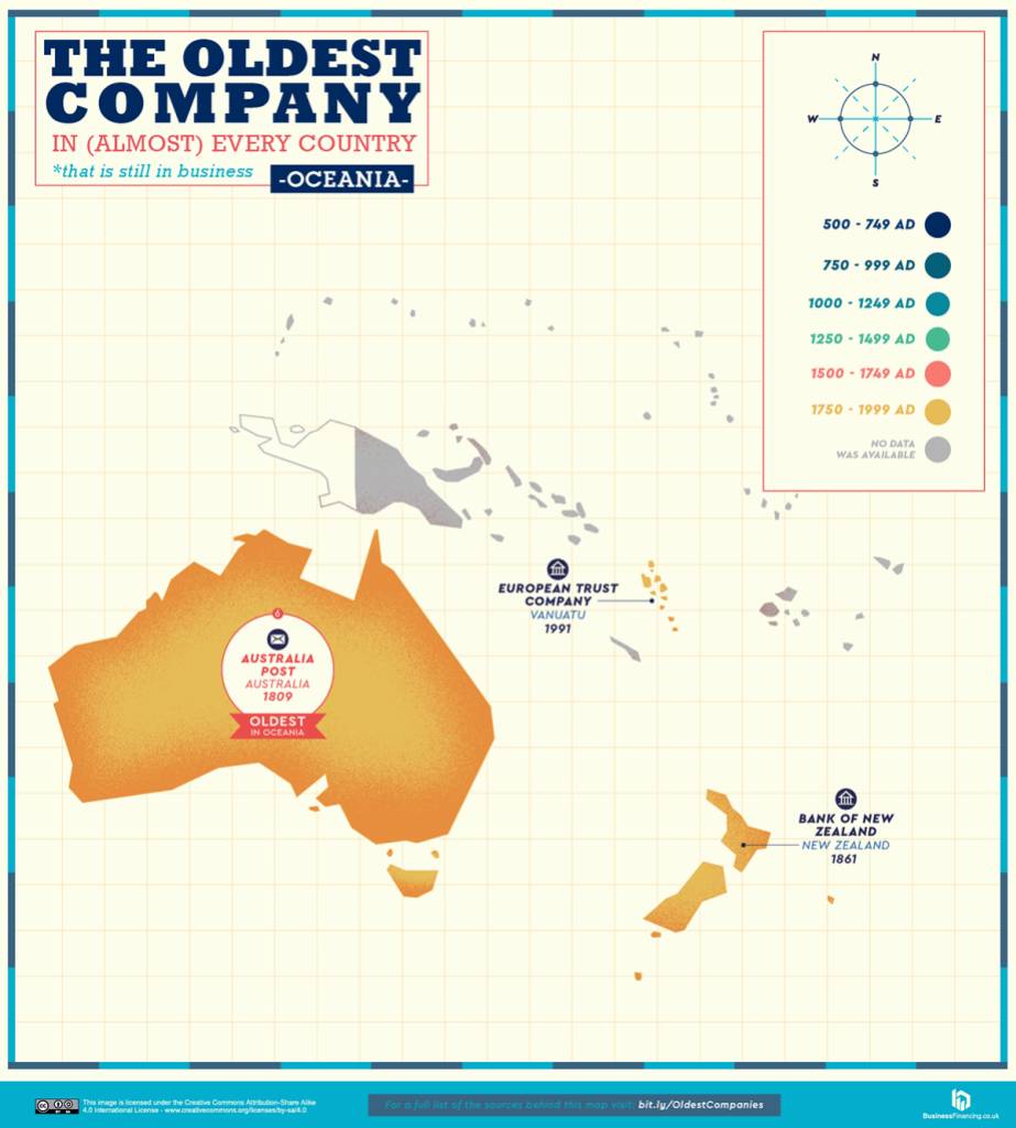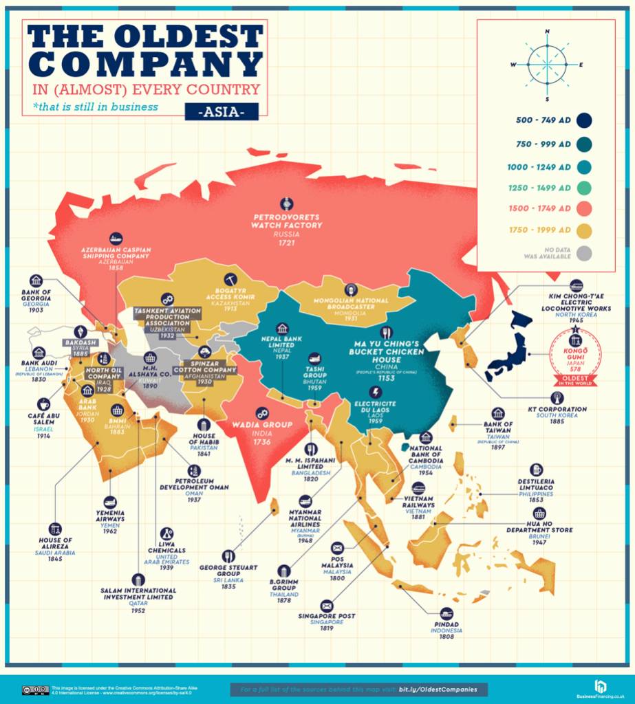 Alguns achados são surpreendentes. A empresa mais antiga ainda em operação está no Japão. É uma empresa de construção chamada Kongo Gumi, que data do ano de 578 e se especializou na construção de templos por 14 séculos.