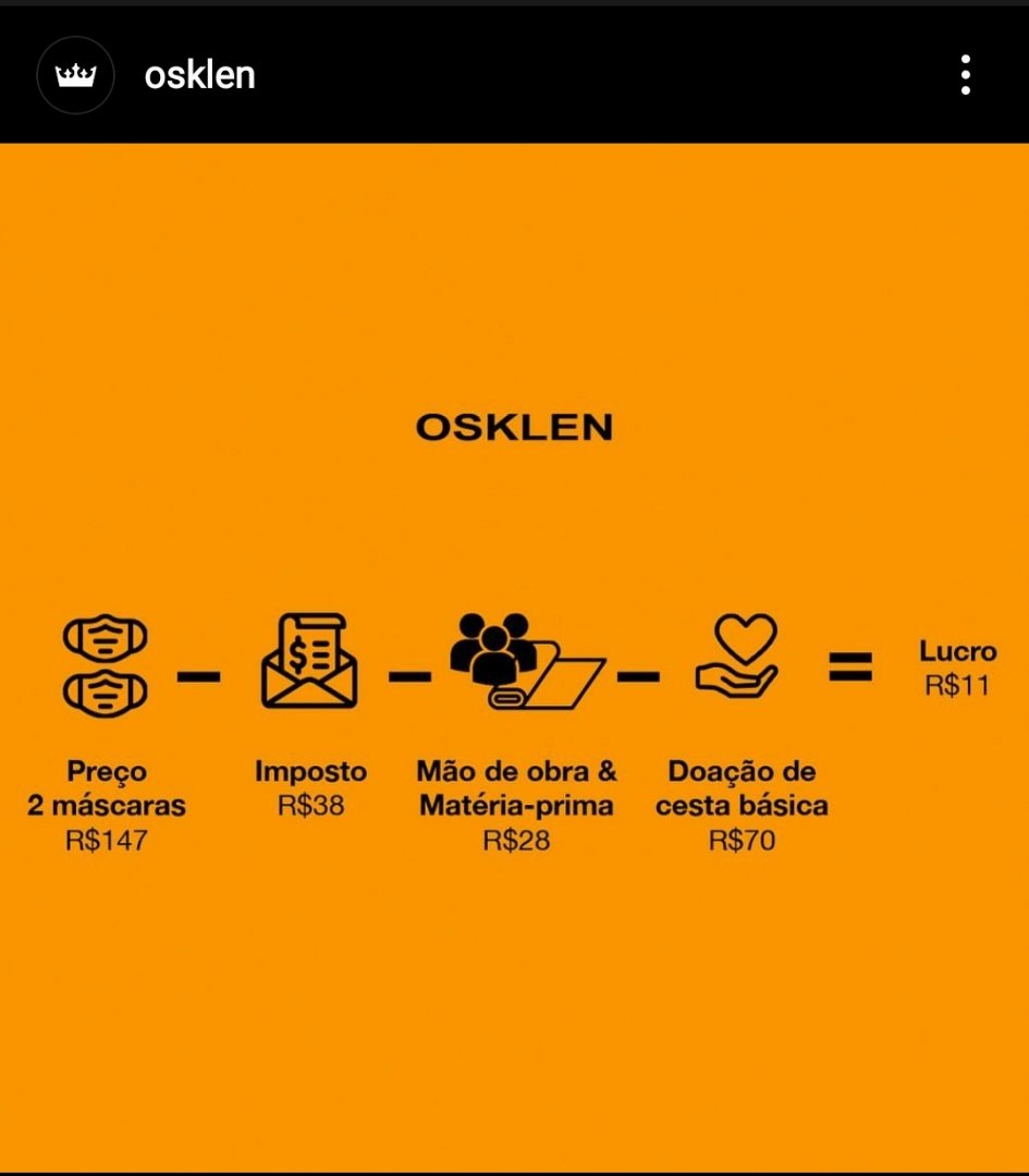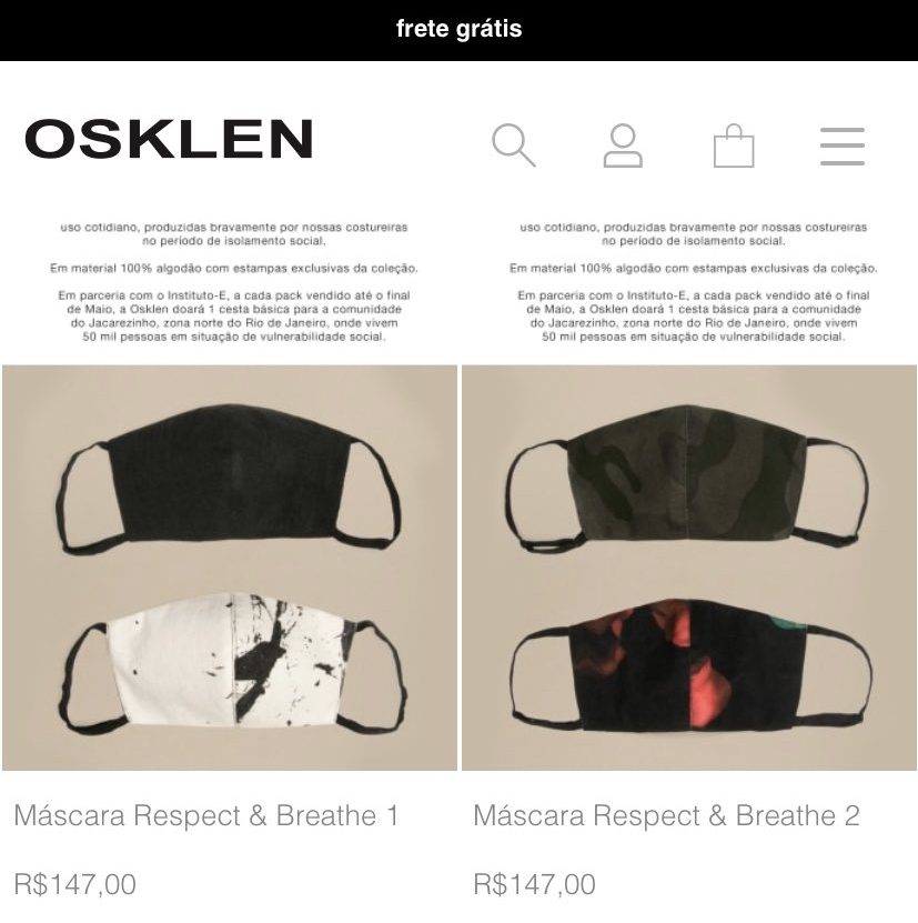 “A Osklen entende que usar máscaras nesse momento é importante e quer levar aos seus clientes mais uma opção com peças funcionais, com design e qualidade”, diz a empresa no post em que justifica o preço, que foi posteriormente apagado.