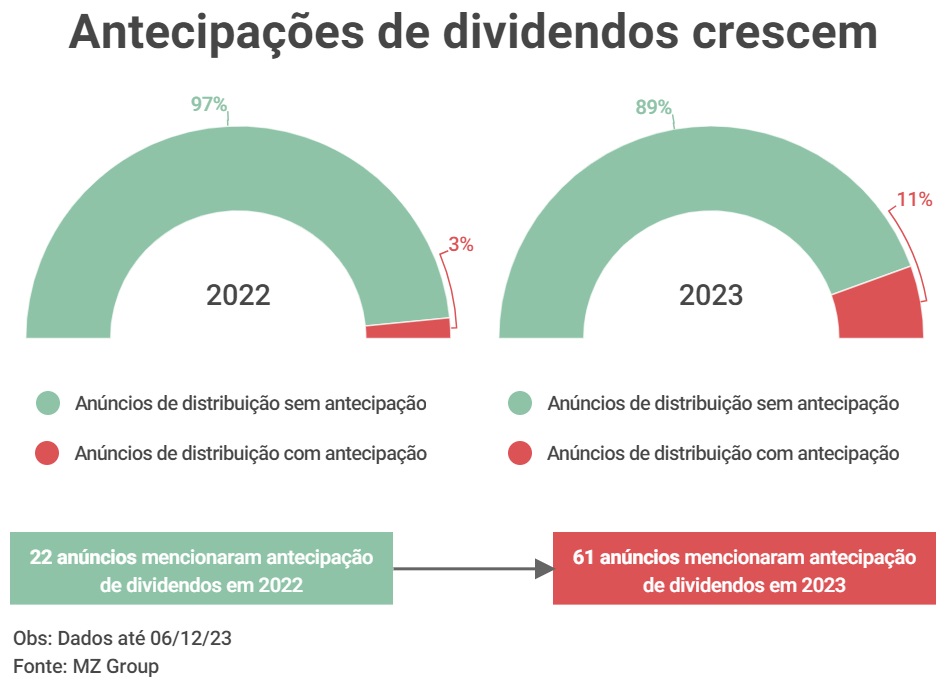 Os dados foram levantados pelo MZ Group a pedido do InfoMoney e consideram todos os avisos aos acionistas e fatos relevantes sobre distribuição de dividendos e JCP arquivados pelas empresas na Comissão de Valores Mobiliários (CVM) em 2022 e 2023. Os casos de adiantamento foram considerados quando os documentos mencionavam a antecipação de resultados.