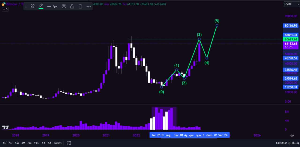 Dentro dessa onda, o próximo alvo do BTC no curto prazo o está na região de liquidez dos US$ 65.625. Caso a cripto encontre resistência nessa região, segundo Ana, a moeda digital pode passar por correções até um suporte entre US$ 39.776 e US$ 44.352, conforme gráfico abaixo.