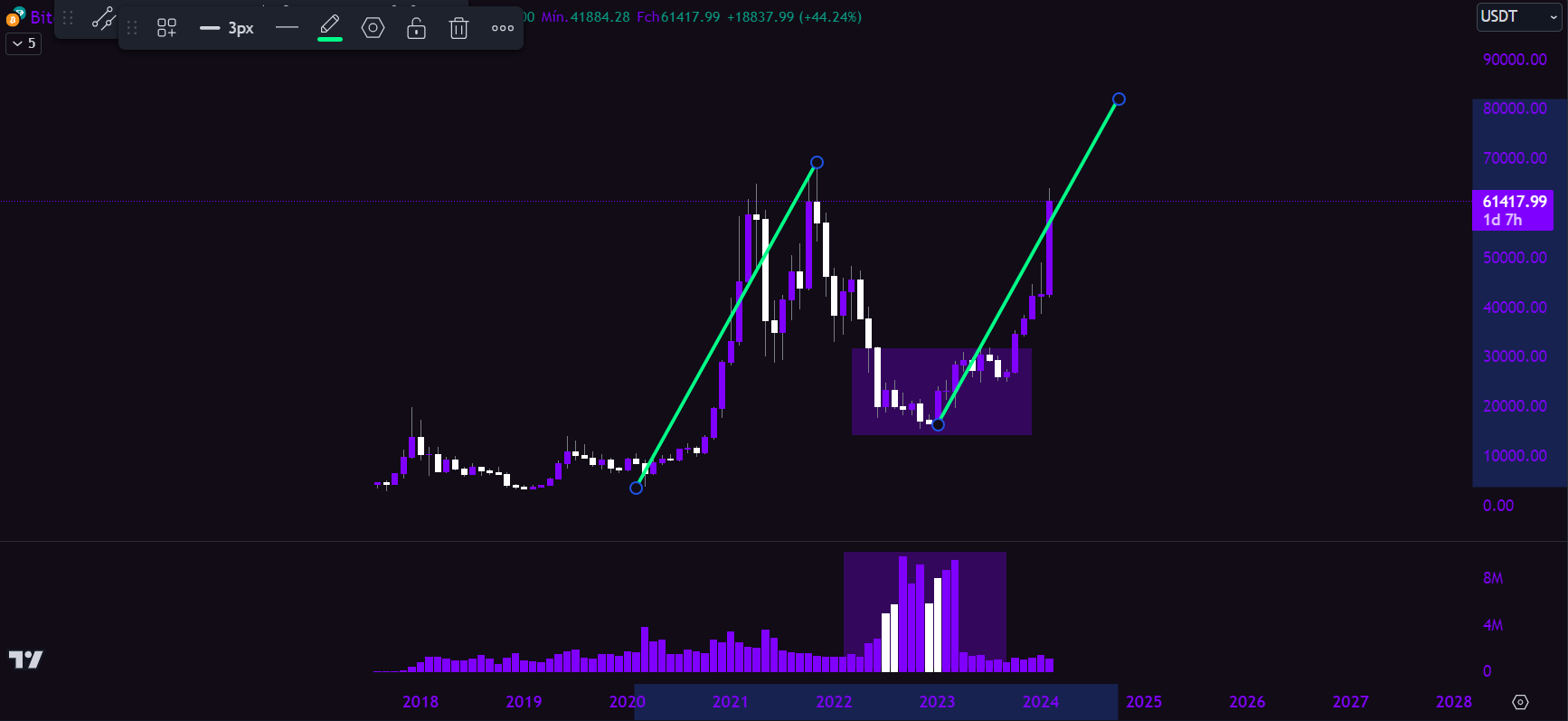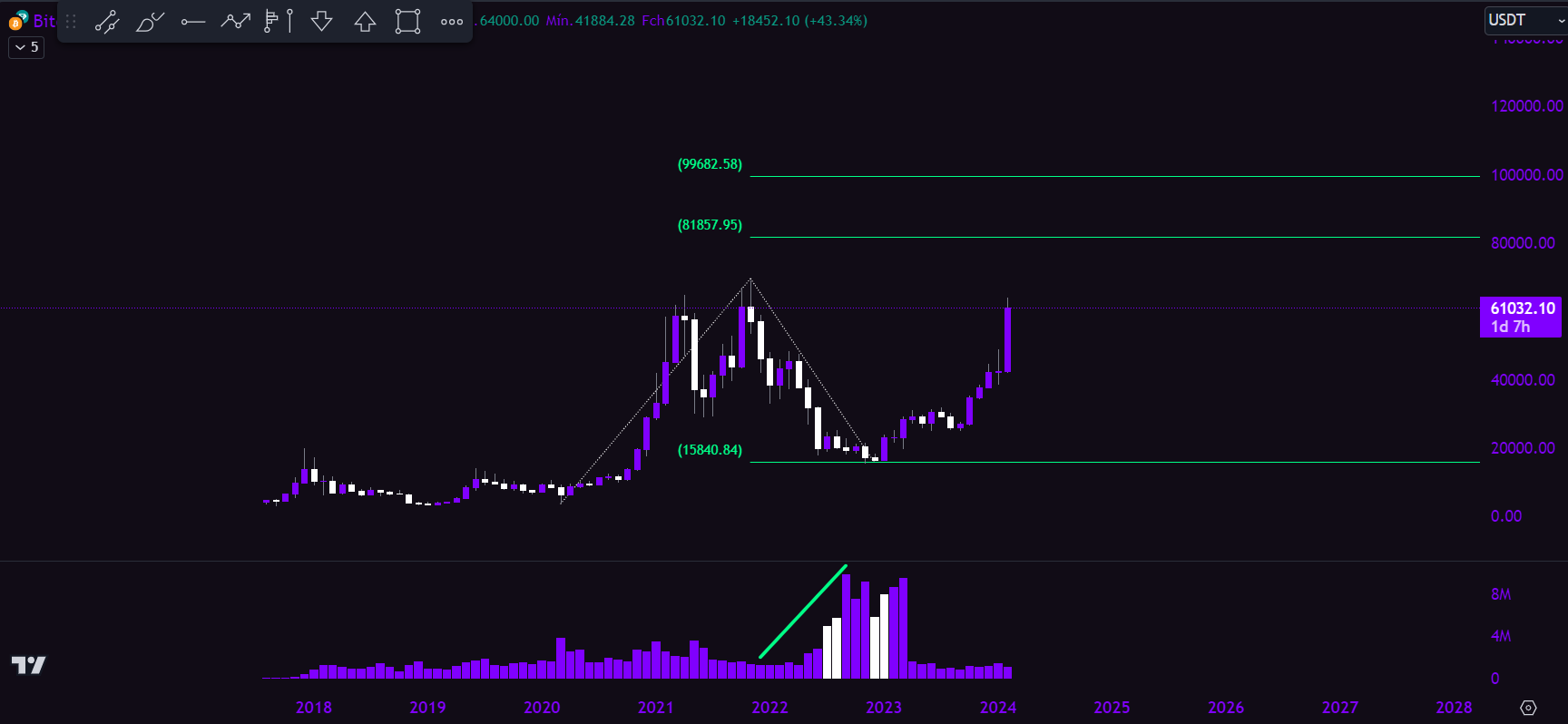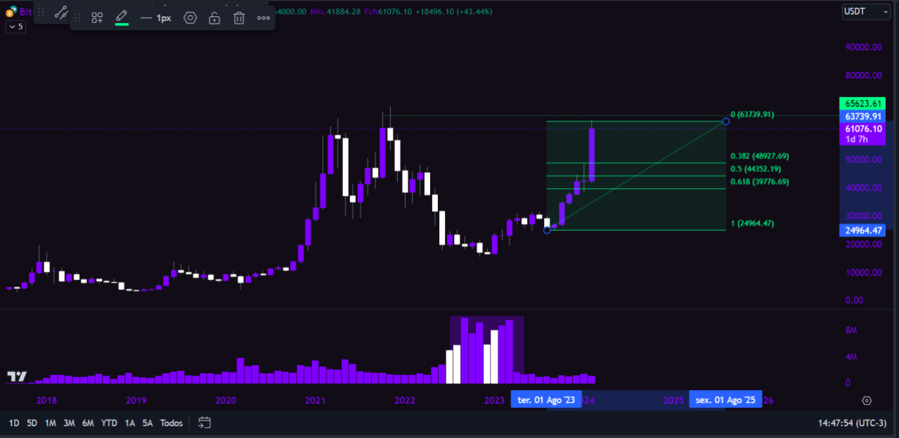 “Na projeção de longo prazo, utilizando a extensão de Fibonacci no gráfico mensal do Bitcoin combinado com a análise de fluxo financeiro, observamos que se o volume comprador persistir, mesmo que ocorram breves correções, o Bitcoin pode replicar a ‘pernada’ de alta anterior, formada entre março de 2020 e novembro de 2021″, falou.