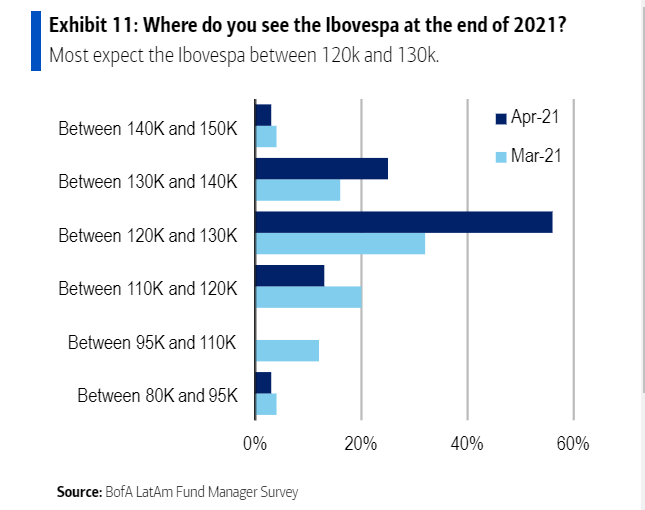 A parcela dos que veem o Ibovespa encerrando 2021 acima de 120 mil pontos cresceu de 52%, em março, para 84%, em abril. O patamar em si implicaria potencial de valorização de apenas 1% em relação ao fechamento do dia 12 de abril.