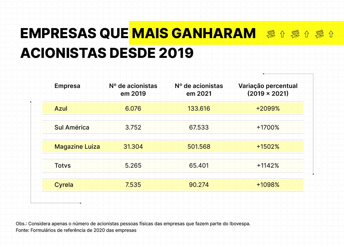 Do total de companhias do Ibovespa, cinco delas apresentaram aumento superior a 1.000% na base de acionistas pessoas físicas desde 2019. Eram elas: Azul (AZUL4), com crescimento de 2.099%, Sul América (SULA11) (+1.700%), Magazine Luiza (MGLU3) (+1.502%), e Totvs (TOTS3), com aumento de 1.142%.