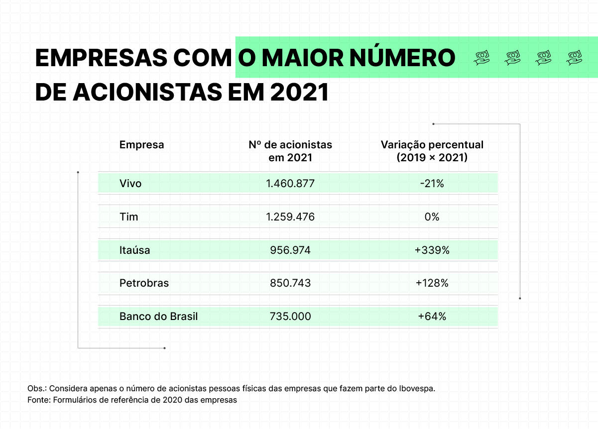 O levantamento revelou também que todas as empresas do Ibovespa, com exceção das operadoras Vivo (VIVT3) e Tim (TIMS3), tiveram crescimento na base de acionistas entre 2019 e 2021.