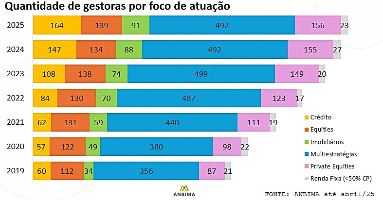 Os números foram divulgados nesta terça-feira (5) pela Anbima (Associação Brasileira das Entidades dos Mercados Financeiro e de Capitais). Apesar do crescimento do crédito privado, as gestoras multiestratégias, que não têm uma especialidade definida, ainda são maioria. As gestoras de crédito privado ultrapassaram as de ações em 2024 depois de terem menos da metade do número de casas focadas na Bolsa em 2019.