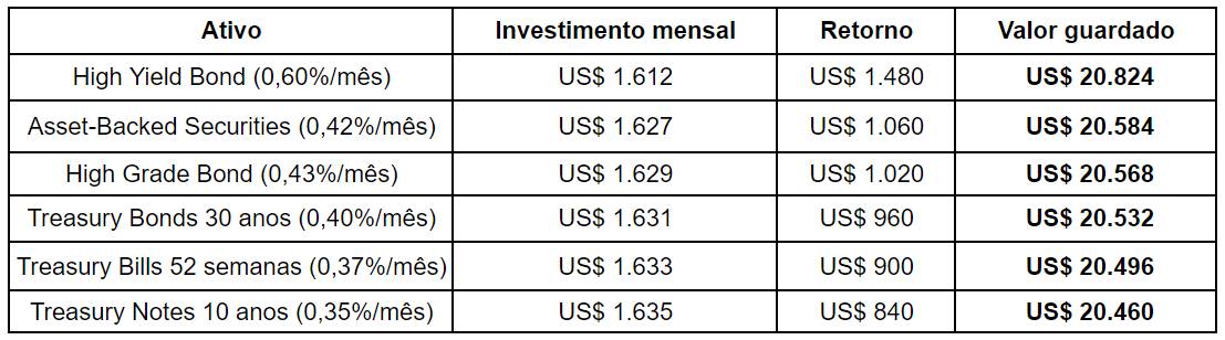 Com investimento mensal de US$ 1.612 e US$ 1.635 ao longo de 365 dias, os produtos entregariam retornos entre US$ 840 e US$ 1.480 no período, a depender da aplicação escolhida, mostrou o estudo. No geral, os títulos privados têm desempenho melhor na comparação com aqueles emitidos pelo governo, mas são mais arriscados.