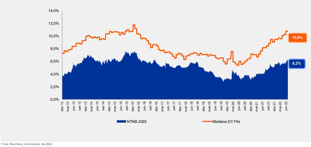 A diferença entre a taxa média de retorno com dividendos dos fundos imobiliários (10,8% em 12 meses) e os rendimentos da NTN-B – título público atrelado à inflação – com vencimento em 2035 (6,2%) está em 4,6 pontos percentuais, de acordo com relatório do Itaú BBA. O número está acima da média histórica de 3 pontos percentuais, o que reforça a atratividade dos FIIs, segundo o banco.