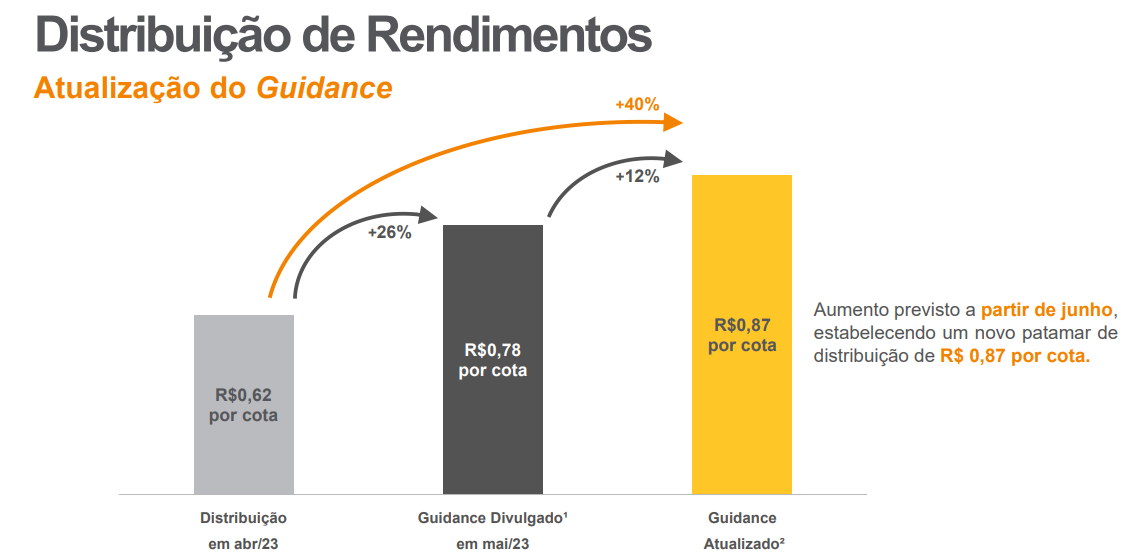 Em junho, o BRCO11 havia atualizado a estimativa para as próximas distribuições de dividendos em 40%. Inicialmente o fundo havia elevado o repasse de R$ 0,62 para R$ 0,78 por cota e, na sequência, aumentou a projeção para R$ 0,87 por cota.