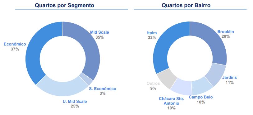 A maior parte dos apartamentos (60%) é classificada como mid scale – intermediários em relação ao conforto e sofisticação – e econômico (40%). Os espaços estão concentrados principalmente nos bairros do Itaim e do Brooklin.